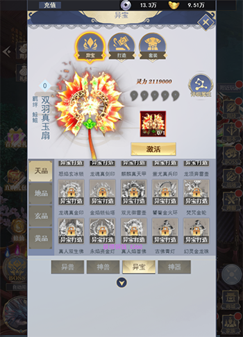 在游戏设定中异兽也是能穿戴装备宝物来提升异兽的战力的,异兽穿戴的装备也叫异宝。而异宝也有分四个不同阶级适应不同阶段的玩家。(天品>地品>玄品>黄品)