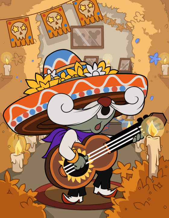 佩克斯舅舅头戴色彩斑斓、饰以鲜花的宽檐帽,系着鲜艳的紫色丝巾,足踏白色翘尖皮鞋,显得年轻活力、动感十足,连原来顺滑的胡须都烫了个俏皮的卷,站在家的壁炉旁高声歌唱,歌声好像温暖的阳光。手中的木吉他是它珍藏多年的老伙计,弹唱之间更隐含巨大的威力,让它在猫鼠追逐中从容欢唱最浪漫的老歌。
