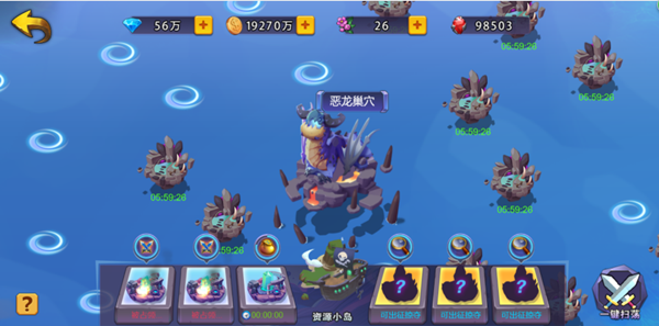 恶龙巢穴为固定岛屿,玩家挑战岛内BOSS可以获得丰厚奖励,战胜BOSS可以获得额外奖励。每个玩家初始拥有3座资源小岛,可以通过占领最多占领其他玩家的3个小岛在获得战斗奖励的同时还可以获得额外的花园矿物产出加成。