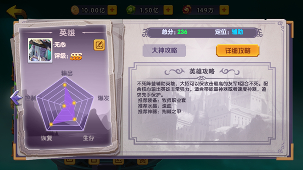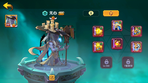 无心:不死阵营辅助英雄,大招可以保攻击最高的友军1回合不死。配合核心输出英雄非常强力。适合带能量神器或者速度神器,追求先手保护。
