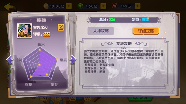审判之刃:强大的爆发型刺客,通过普攻和队友暴击累积“审判之力”层数,造成极高的单体伤害。将目标击杀后溢出的伤害会攻击其他目标,不会浪费伤害。10星时只要击杀目标,立刻回满血,生存能力也很强。