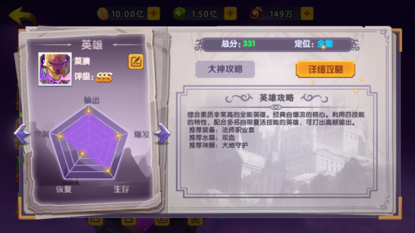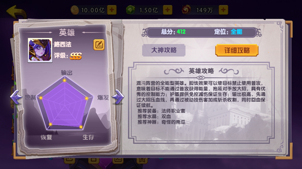 路西法:混沌阵营的全能型英雄。胆怯效果可以使目标禁止使用普攻,意味着目标不能通过普攻获得能量,拖延对手放大招,具有优秀的控制能力;护盾提供免控减伤保证生存;输出极高,先通过大招压血线,再通过被动技伤害加成斩杀收割,同时回血保证续航。