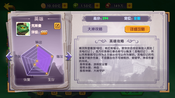 克斯曼:精灵阵营最强1号位,能扛能输出。受到攻击给全体敌人添加【龙龟印记】。我方任意单位暴击都可以触发【龙龟印记】,所以克斯曼既可以作为主力输出也可以作为辅助。龙龟印记的伤害属于额外伤害,不会暴击也不可被格挡,受破甲、神圣伤害的加成。