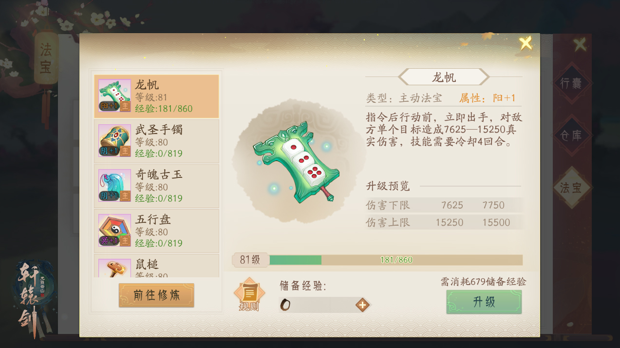 除了初始的属性提升、专属技能等效果外,少侠还可通过消耗法宝储备经验进行升级,大幅增强技能效果。法宝护体,战斗定能如虎添翼!