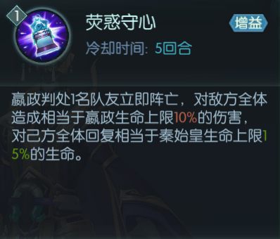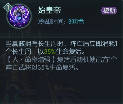 复活流的核心理念就是复活足够多的阵亡武将,但【荆轲】、【狄青】的【亡魂】技能有6回合的冷却时间,【屈原】技能【九歌】的冷却时间也有5回合。而【嬴政】的技能【始皇帝】不但能在自身阵亡时复活自身,还能复活一个随机队友,且冷却时间只有3回合。
