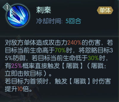 【狄青】是复活流中较为全面平均的武将,即便没有触发复活后的【狂化】效果,【狄青】也可凭借技能【狄青降龙】获得无法驱散的【反击】和【挑衅】效果,兼顾控制与输出的能力。