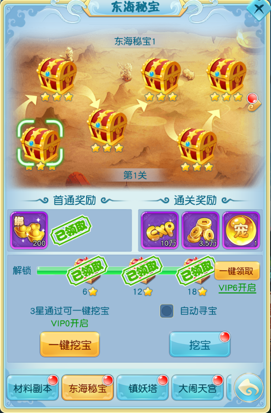 这个副本呢,每关拥有6个宝箱,6个宝箱都开启后就可以进入到下一关啦。但是这个是根据战斗胜利时间的长短来获取宝箱的星级的,最高是三星;当前关卡累计星级达到一定等级后就可以解锁获得宝箱啦~到后面可以选择自动挖宝模式获取奖励,或是VIP玩家直接使用一件挖宝获取~
