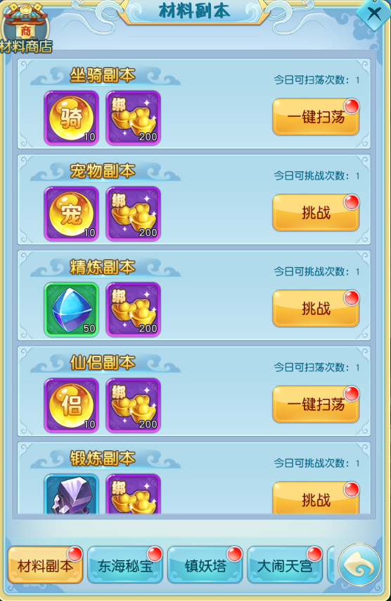 随着玩家的等级提升,逐步会开启不同的材料副本,每个材料副本每天可以免费挑战一次,之后可以使用元宝进行扫荡~挑战胜利后可以获得大量绑元以及对应的材料奖励哦~