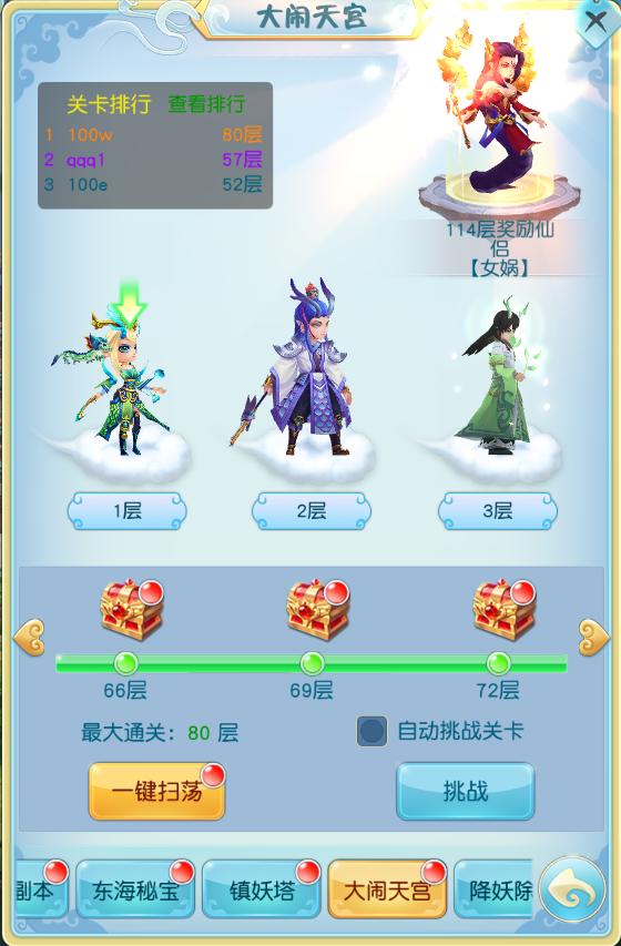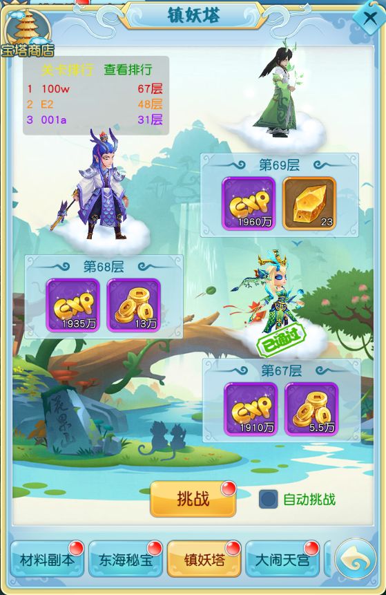 大闹天宫也是跟镇妖塔一样,是由低往高向上开始挑战,挑战胜利后可以获得大量的进阶材料,而且需要挑战胜利后才可以进行挑战下一层,如果挑战失败,也是只会停留在当前的层数不变~通过达到一定层数之后,就可以领取对应的通关宝箱奖励。当然,你也可以选择自动挑战关卡,或者是一键扫荡之前已经通关过的关卡