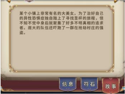 根据游戏里英魂故事介绍,她是某小镇的大美女,为了治好自己的异性恐惧症独自踏上寻找圣杯的旅程,但不知不觉中身后聚集了许多不明真相的追求者。庞大的队伍还吓跑了一群在抢劫村庄的强盗。
