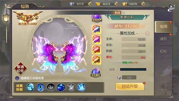 3. 仙羽升级使用银两进行升级,升级成功直接加战斗力。