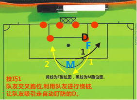 技巧1,利用队友进行绕桩交叉跑位,D如果长安自动盯防,会被我方M吸引走,F快速下顺到饼位点,要球吃饼。