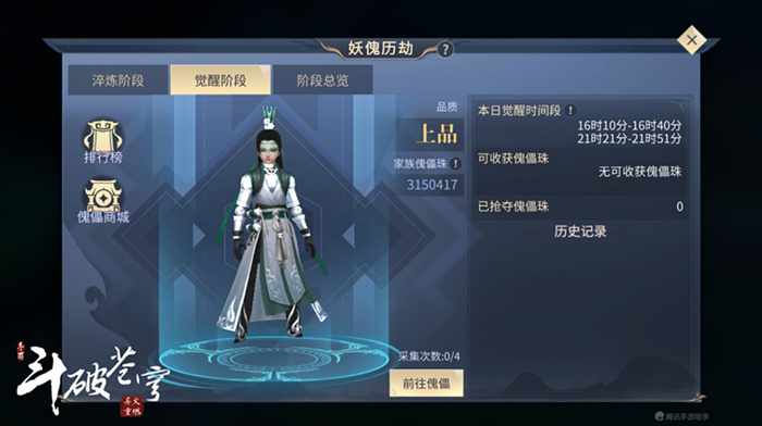 展示阶段:周日0:01—周一9:59为傀儡展示阶段,全服淬炼分最高的三个傀儡会进阶为天妖傀雕像进行展示,斗者们可以对天妖傀雕像进行瞻仰,每日可获得一份天妖傀奖励。