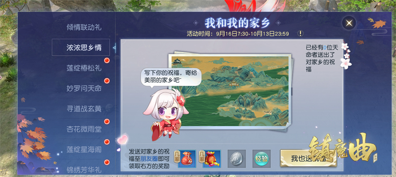 无论身在何方,故乡总有我们众多牵挂,天涯游子也难挡夜半思乡之情。为此《镇魔曲》X《我和我的家乡》联动活动专门开辟了朋友圈广场“我和我的家乡”,天命者们只需要写下对家乡的寄语、祝福、思念等内容,或是晒出家乡的风光美景、特产等内容,发送到广场上与其他天命者们分享,就能获得丰厚的家乡赠礼!