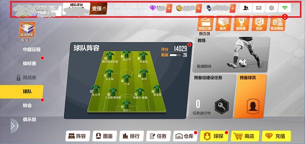 点击确认回到主界面,可以看到橘黄的配色也是非常中超!这个界面按键非常多,最上面一排依次是玩家信息、球队评分、变强推荐、钻石、金币、体力、好友、邮件和设置。