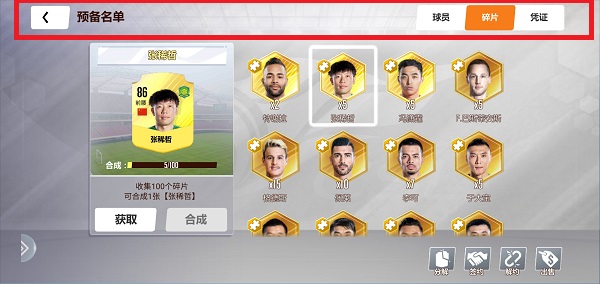 回到主界面看左下方预备球员,点开之后,如果是新手会看到提是说没有预备球员,不要着急!!这不是重点,重点是最上一行的导航栏变了,现在是在球员界面,点击碎片就会跳到碎片界面,在这里就可以看到你抽球员抽到的碎片啦!记住了在【球队→预备球员→碎片】这里查看碎片,并且可以进行碎片合成!银卡需要60个碎片合成一个球员,金卡和顶金都是100个碎片。