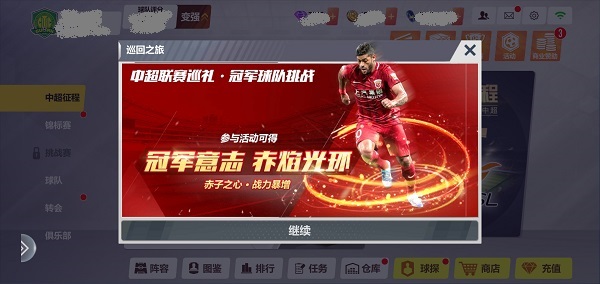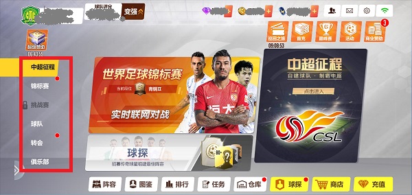 回到主界面我们看最左侧一排,这是我们的导航栏,当前所在的界面就是【中超征程】界面,大家可以在这里点开中超征程,球探,世界足球锦标赛三大模块。点击世界足球锦标赛就会跳转到锦标赛界面,也就是导航栏的第二个按钮。导航栏的第三个按钮是挑战赛,挑战赛将在25级解锁,所以现在是灰色的。