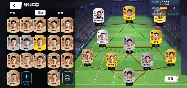 第三个按钮就是球队,在这里我们可以看到球队阵容、教练、预备役建设任务、预备球员,点开阵容,左下角有一个查看后备,就卡一查看近期签约的球员啦,如果想要上阵,直接拖动到相应位置就可以了。小编这个阵容不太行,连接线都是红色的,要最好做到绿色连接线才是最默契的呀,默契度这方面,同队球员就是绿线,同地区球员就是黄线,非同队同地区则是红线,也就是一点默契度都不加的。