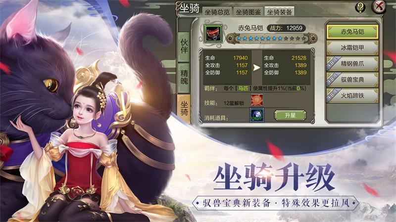 全新功能开启,坐骑装备系统上线,玩家可以通过商城或其他方式获得坐骑装备——赤兔马凯、精刚兽爪、驭兽宝典、火焰蹄铁、冰霜铠甲,不同的坐骑装备拥有不同的功能,可增加防御、生命、攻击、命中等属性。还能对坐骑装备进行升星,升星可以提高人物属性,将坐骑装备升至12星,将会激活专属坐骑技能,大幅提升自身战斗力哦!