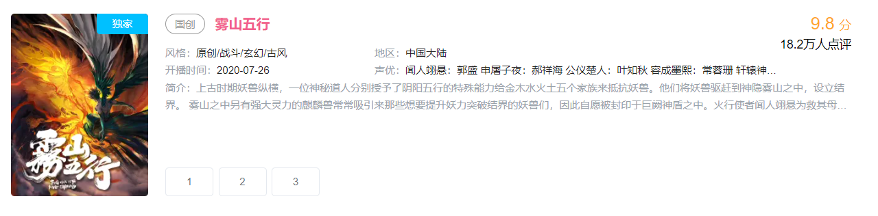 而在B站刚刚发布的国漫——《雾山五行》正是新生代武侠作品中的佼佼者。这个由不到十人的小工作室打造的武侠动漫作品,只用了短短三集就成功征服了广大观众,上线前两个月b站播放了超过8700万,豆瓣评分更是高达9.3分,在武侠迷群体中也引发了巨大的反响。