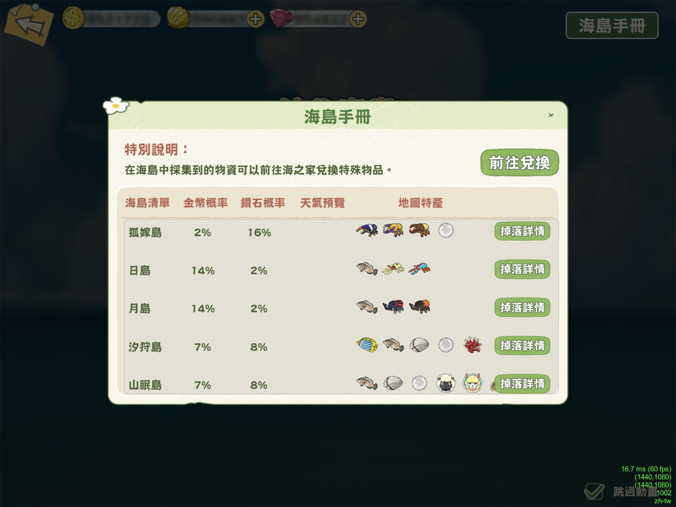 各島嶼機率以及資源將可於碼頭出海前點選「海島手冊」參考喔(如上圖)