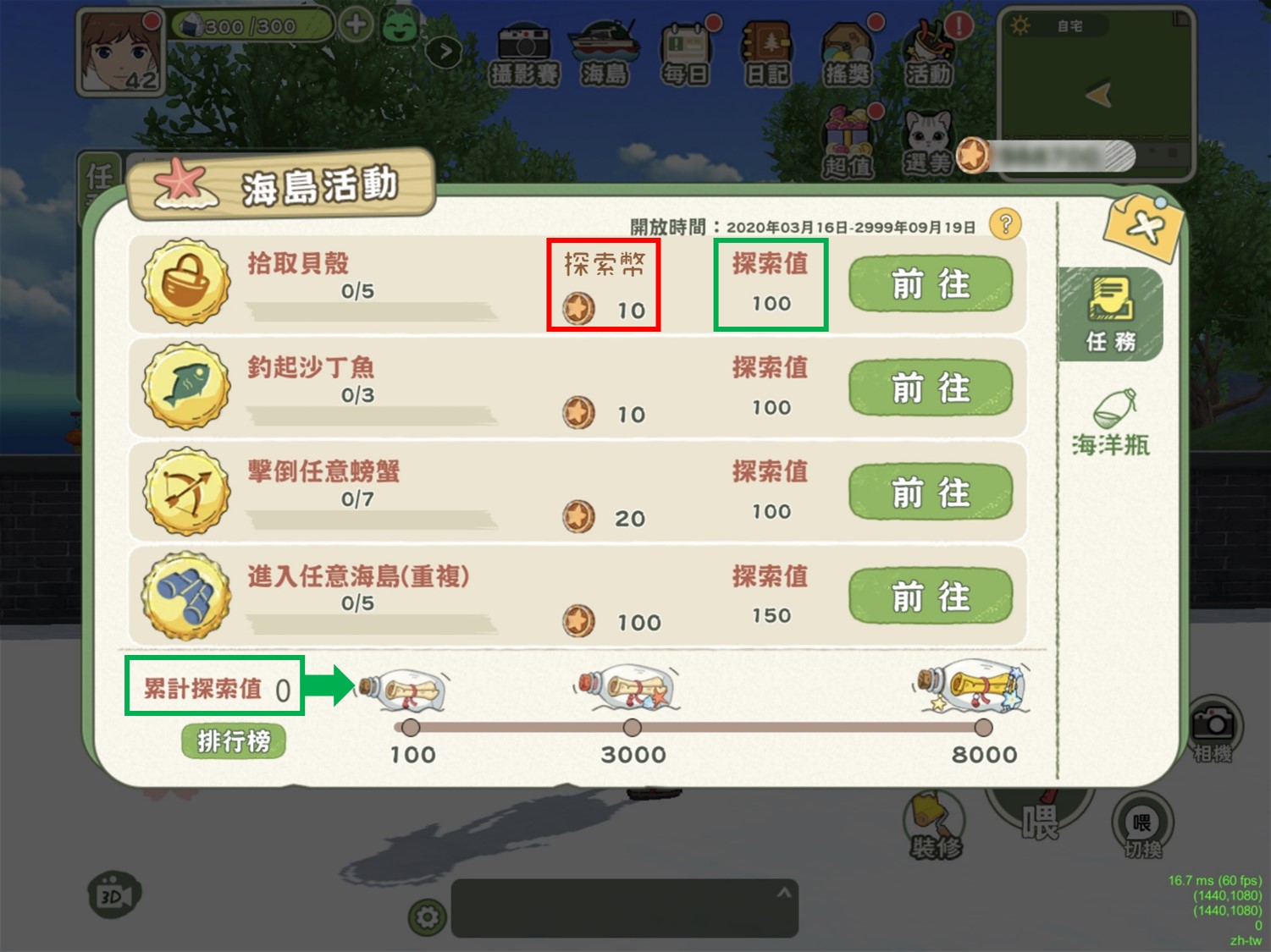 2、透過完成任務獎勵提升探索值、及獲得探索幣,並進一步解鎖「海洋瓶」。