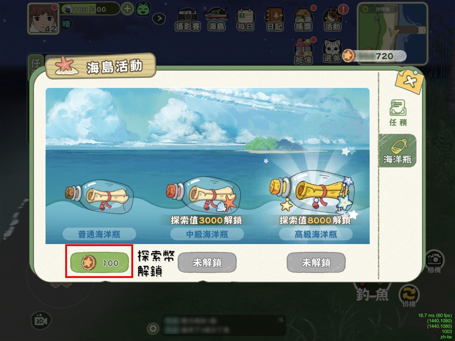 解鎖後海洋瓶可透過扣除「探索幣」抽取獎勵。