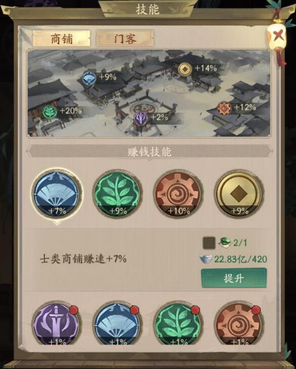 对比起商铺技能,知己的门客技能在前期的收益贡献相对会比较少。等掌柜的各项等级都提升了,再考虑点这个也不迟。