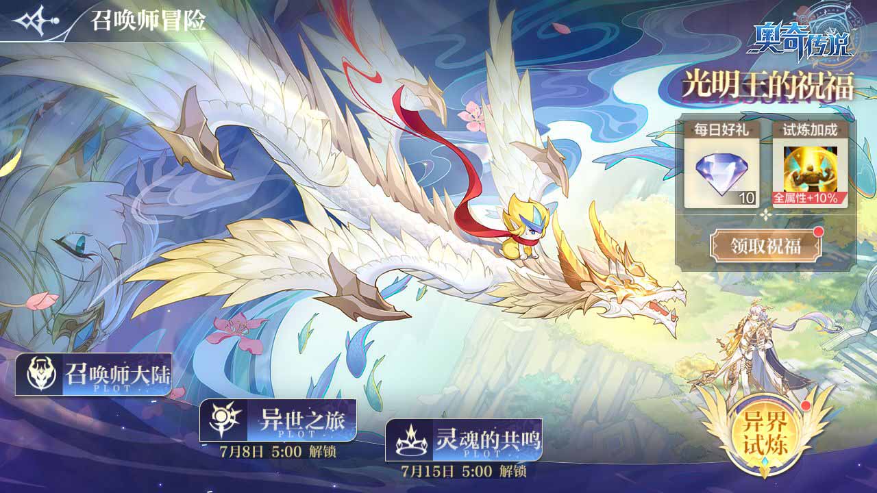 召唤师系列剧情将在7月2日版本更新后同步上线,「召唤师冒险」剧情副本包含「召唤师大陆」、「异世之旅」、「灵魂的共鸣」三个章节,消耗 [光明能量] 通过剧情关卡、试炼关卡可获得钻石、光明之轮等奖励。还可参与「梦想试炼」玩法,试炼分为曦光、破晓、极耀三种不同难度的试炼,每个难度中都有数个关卡,参与试炼过程中会有不同的buff加成,通过或扫荡试炼都可获得「光明之轮」作为奖励,通过收集「光明之轮」,可在光轮夺宝活动中进行抽奖,抽取光明王之魂、钻石、超级星元等奖励。