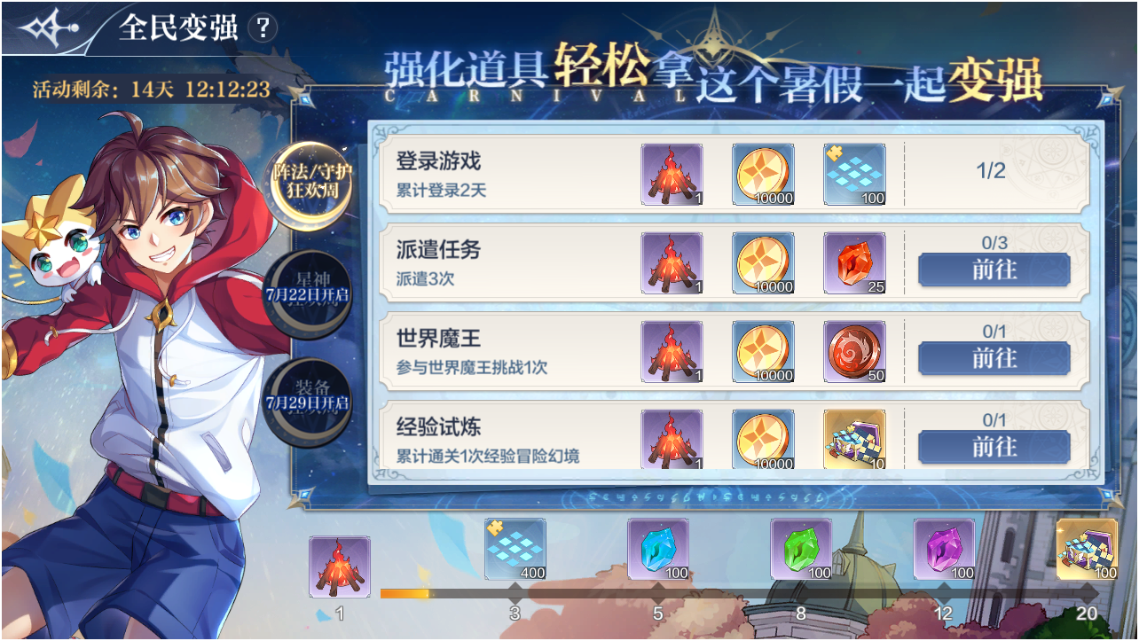 活动内容:阵法/守护、星神、装备——暑期狂欢周开启!完成任务即可领取丰厚奖励,快来一起变强吧!