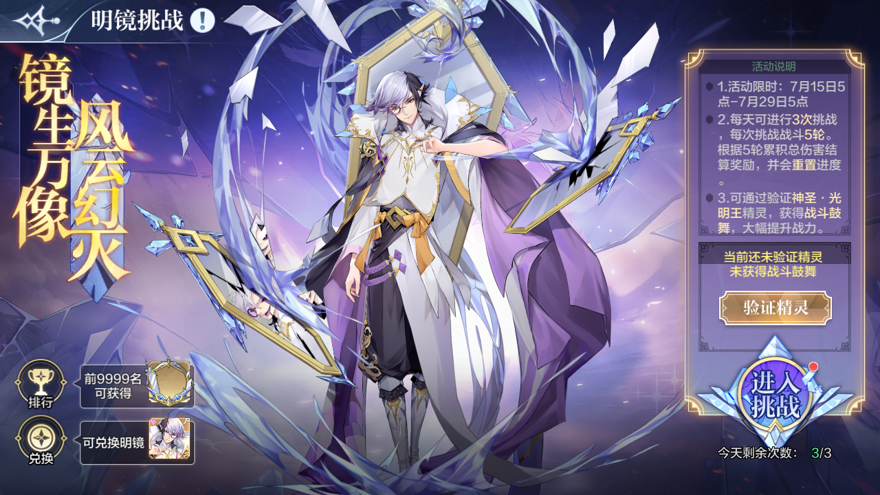1、每天可进行3次挑战,每次挑战都可与明镜战斗5轮。根据5轮累积总伤害结算奖励,并会重置进度。