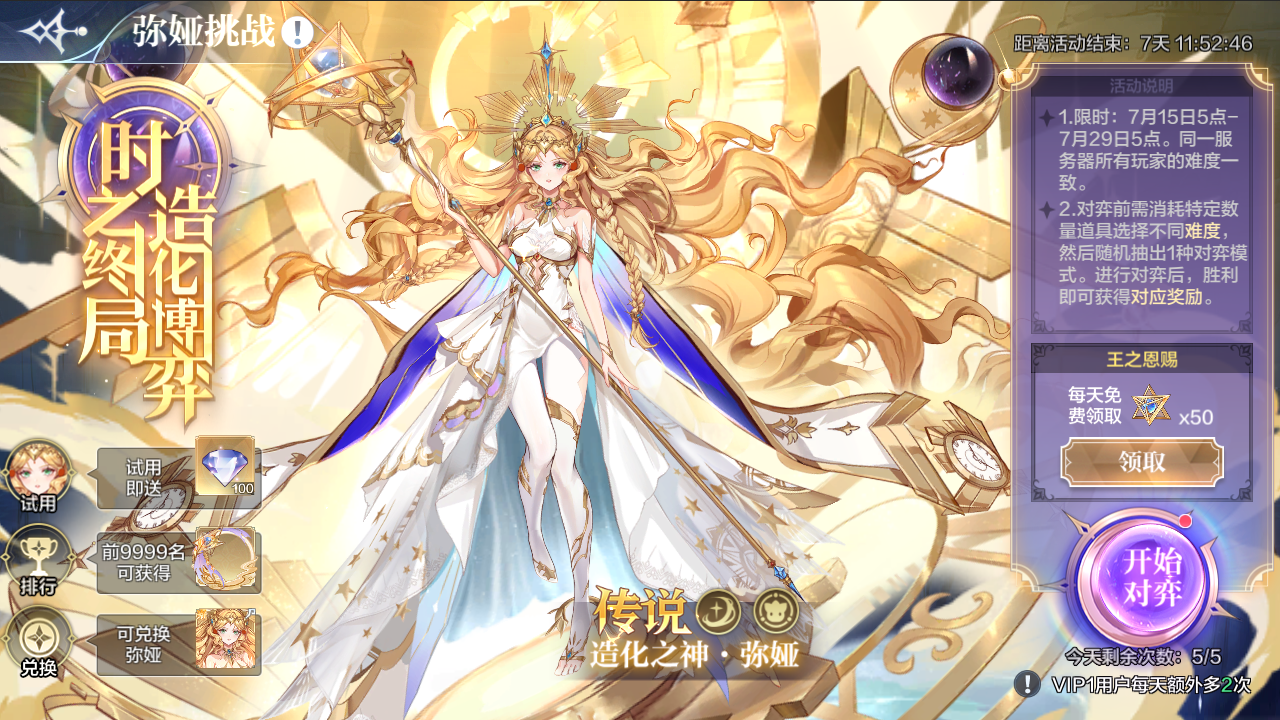 活动内容:[时间回溯]高级召唤限时回归,时间王者·诺亚概率UP(与上一次UP概率一致)!累计神唤120次后,可直接额外领取[时间王者·诺亚*1],累计神唤240次后,可自选获得[时间王者·诺亚*1]或者[造化之神·弥娅*1]