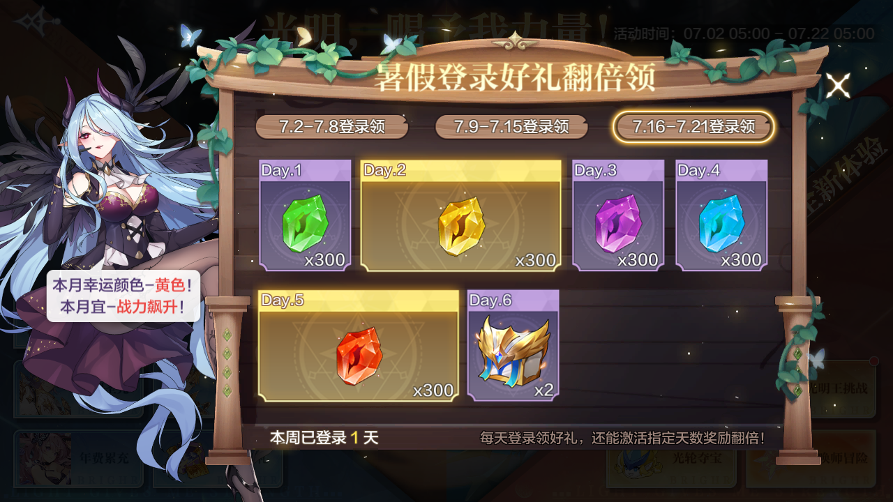 活动内容:暑假登录好礼翻倍领,登录前5天可领取各系别守护符石,快速提升精灵守护战斗力! 登录第6天即可获得橙色装备职业自选箱*2!