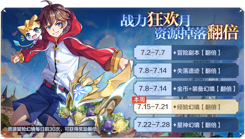 活动内容:受到光明王的祝福,经验幻境掉落翻倍开启,除首通、完美通关奖励外,基础奖励掉落翻倍!