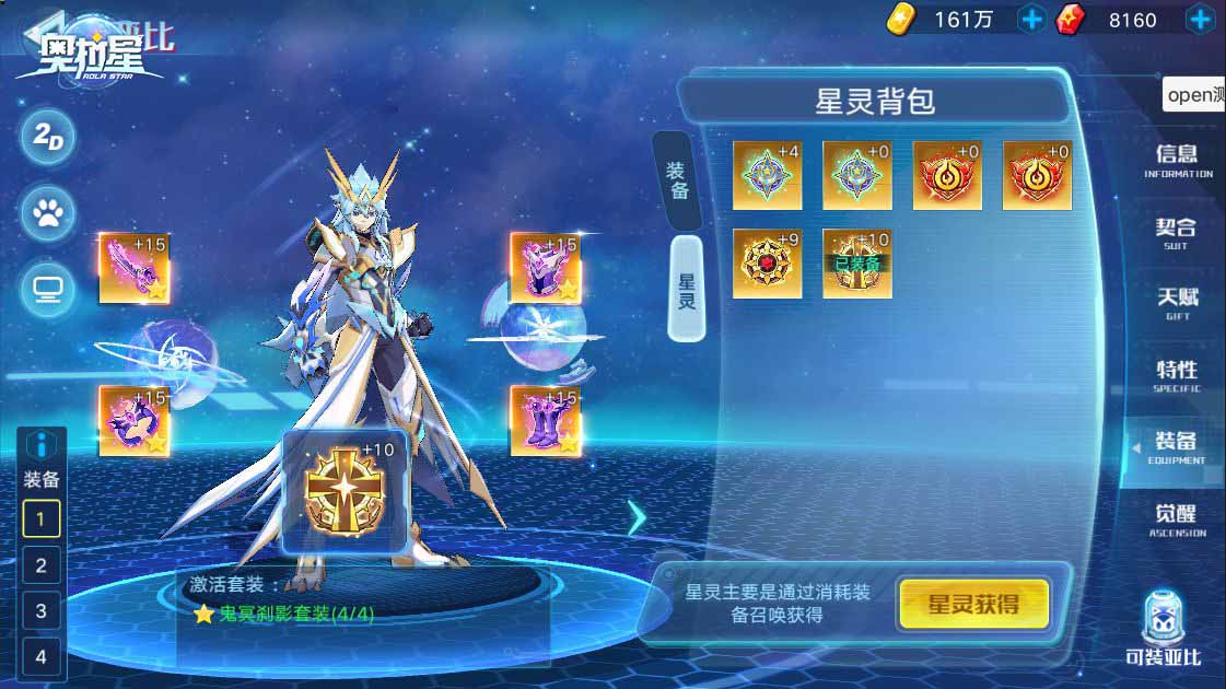 玩家等级达到100级后,即开放星灵系统的养成,玩家可以通过开放了星灵的亚比的“装备”分页中打开星灵背包,进行召唤星灵。星灵包括属性加成以及“灵技”,亚比穿戴了星灵后,即可获得其属性加成,且可以在战斗中使用“灵技“。每种金装套装都有其对应的星灵,不同的星灵拥有的灵技不一样。召唤星灵需要消耗对应套装的金装、若干【星光】以及1个【璀璨合金】。【璀璨合金】通过星灵应援团、来自雾山、焕离神火、巨阙神盾等活动获得。