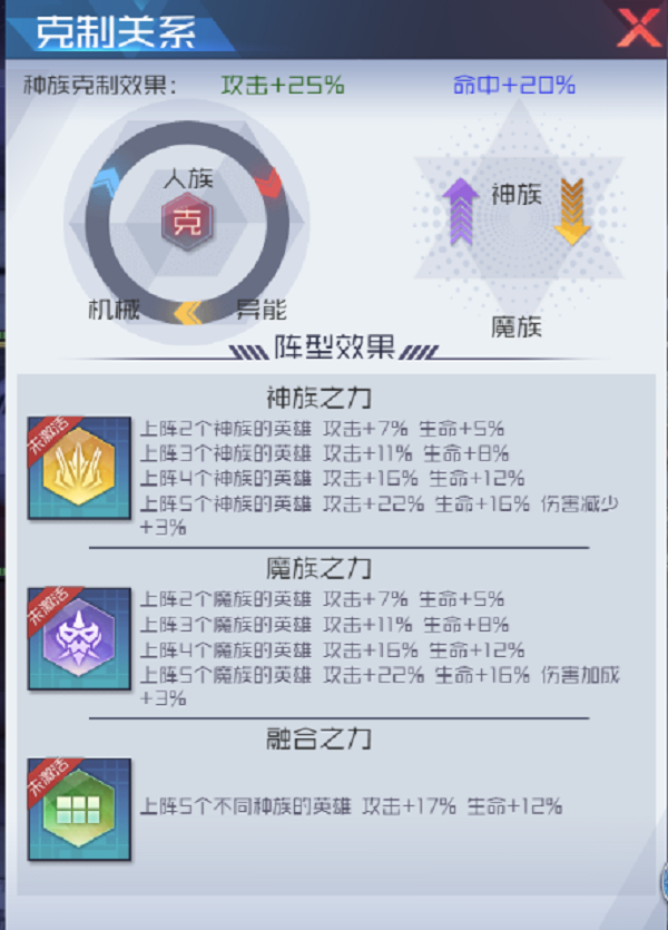 除了相同种族的英雄外,还有一个特定的阵营效果-融合之力,即上阵5个不同的种族英雄,也能获得属性加成。
