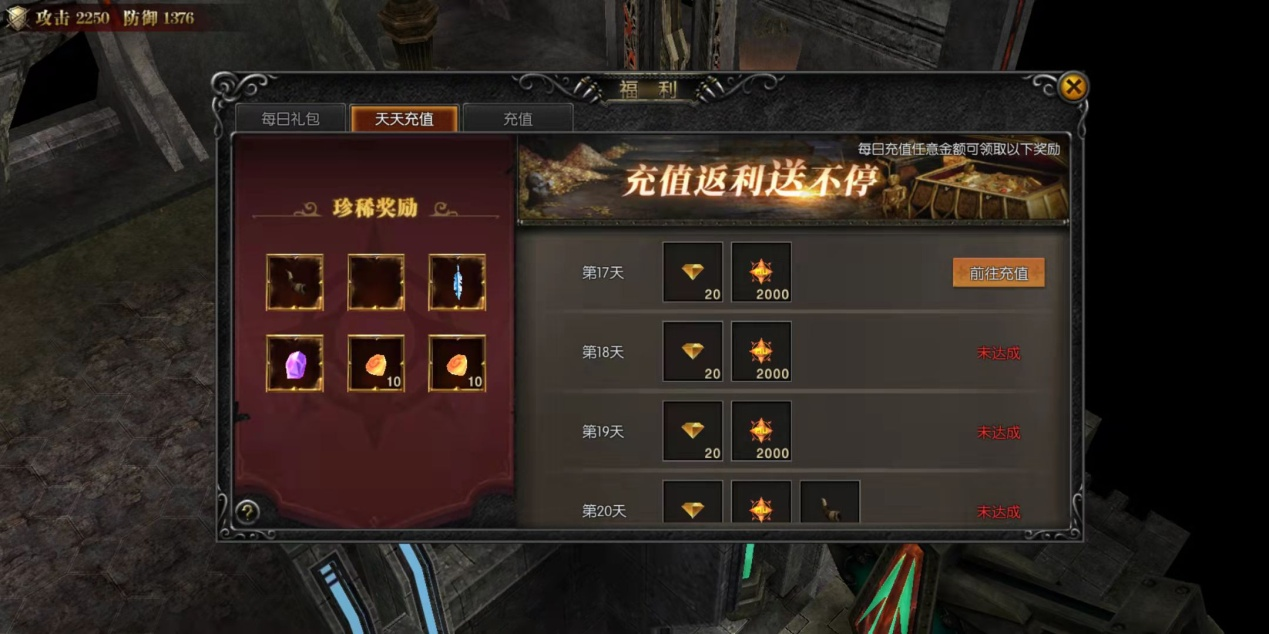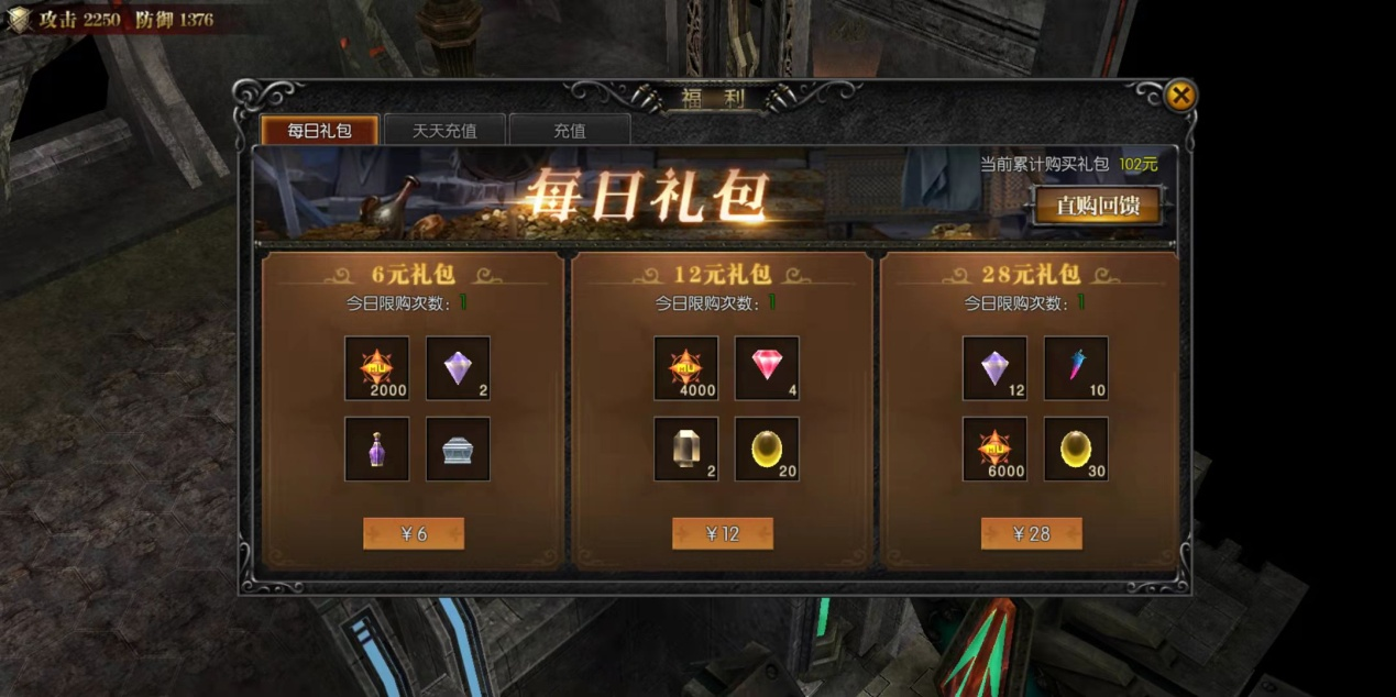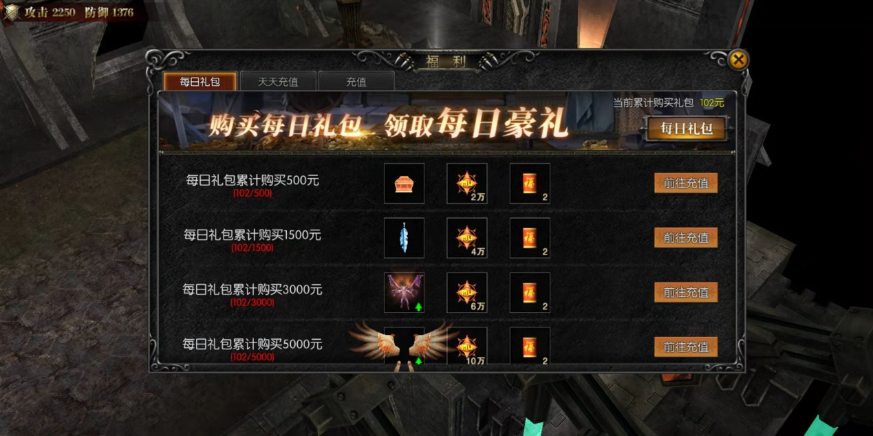 前期等级提升越快,代表着你去新地图没人和你抢boss和黄金怪,这样下去等级优势会越来越明显,而你也越来越好打,装备也会出的比等级低的玩家多,每日礼包的6元礼包建议每天购买,连续充值会送很多东西,炎狼守护,足迹踏浪,洛克之羽一类,可以说性价比非常高,土豪每日礼包看着买,首饰等级提升快可以提前进入卓越boss刷怪,经验爆率都很不错,而且7天后会开启直购回馈,无限生命恶魔以及三代翅膀,绝对是快人一步。