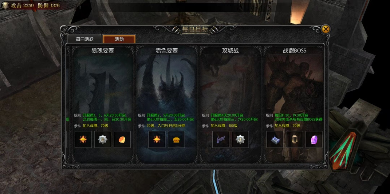 活动的狼魂要塞,赤色要塞,攻城战尽量都参加,给奇迹币和战盟贡献,可以提升战盟臂章。战盟boss每天打两次,拍卖有分红,拍卖品有创造宝石,洛克之羽碎片,生命宝石,卓越晶石,装备等等,价格都要低于商城价,当然拍的过高就不划算了。