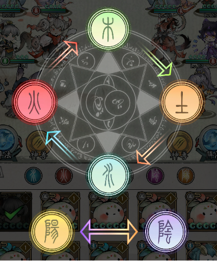 除了阵营克制外,不知道细心的道友有没有发现,我们在对战局中还加入了阵法设定,即在当前出战的圣灵阵容中,六系属性会组成不同的阵法给队伍带来属性加成。