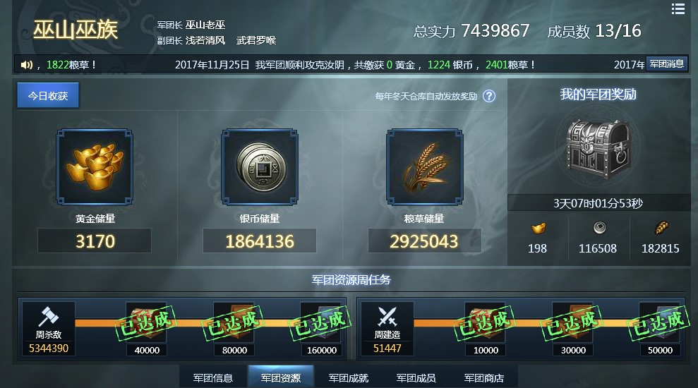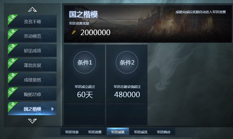军团成员经过不懈努力,可以达成各种军团成就,拿到相应的奖励。这些奖励会自动进入军团资源,发放给成员。