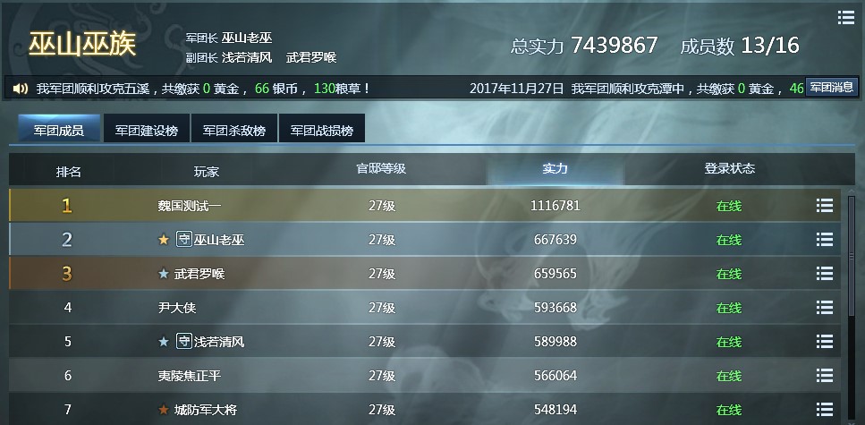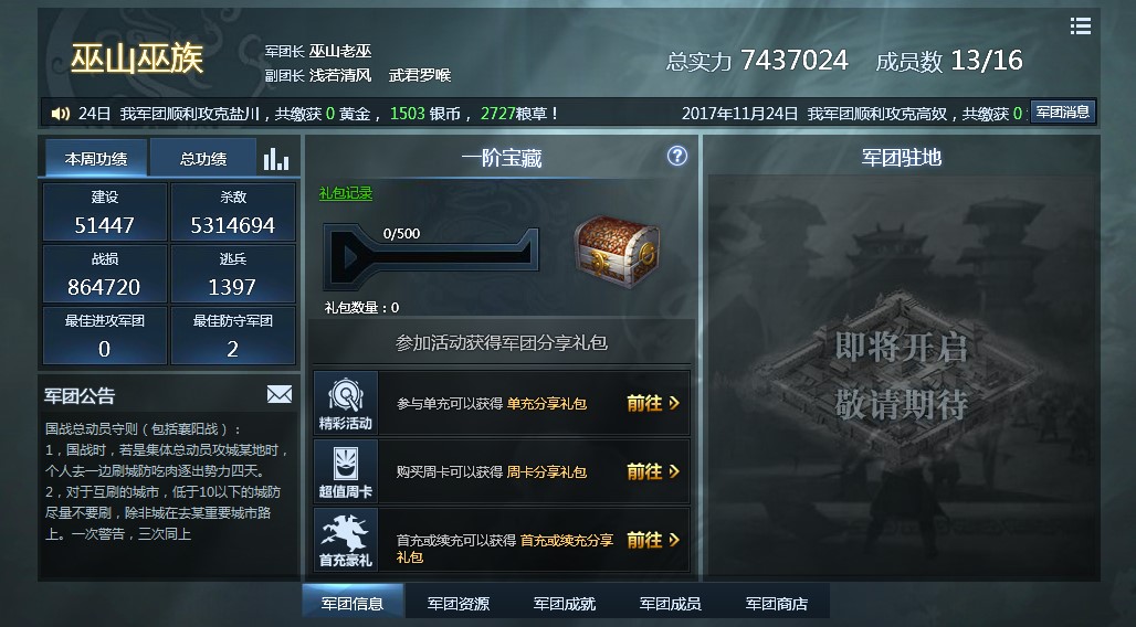 显示本周军团的建设、杀敌、战损等信息;军团长可以发布公告;告知各类与军团相关的活动等。