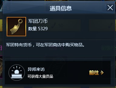 军团商店可以用刀币购买加速、补兵等道具,还是很有用处的。刀币可以从异邦来访处获得。