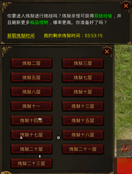 挑选适合等级的炼狱地图,带好红药蓝药,就可以传送去炼狱进行挂机,每个炼狱中设置了专门挂机点,怪物更加集中,掉落更好,经验更高。