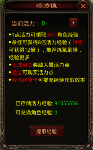 玩家可以使用活力宝玉提取储存的活力经验,1个活力宝玉可以提取30w活力经验。