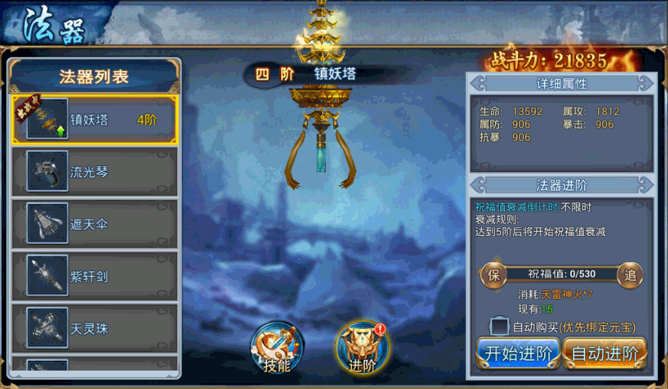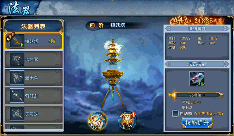 法器的能力提升分为进阶和技能两个方面,使用不同的材料可以分解进行提升,每次提升都有海量战力加成哦。