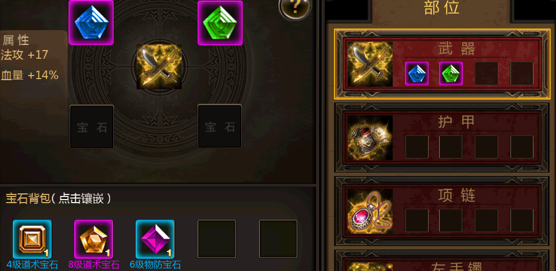 7个装备部位都可以镶嵌宝石,每个装备部位最多可以镶嵌4颗宝石,每个部位同类型的宝石只能镶嵌1颗,也就是说最多可以镶嵌28颗宝石。