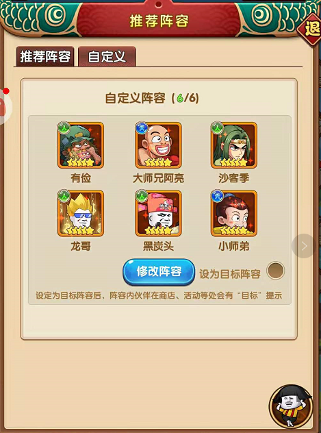 推荐阵容:龙哥、黑炭头、有俭、沙客季、大师兄、小师弟;小伙伴搭配无尘、铁釘、大头胖和尚、长眉大师傅 、马脸妞、艾飞、四凤凰-菊、妙手乌龙