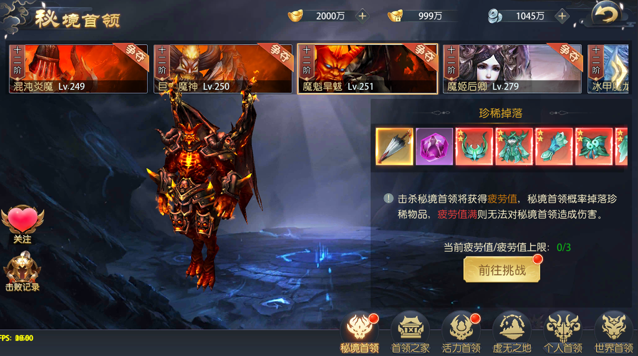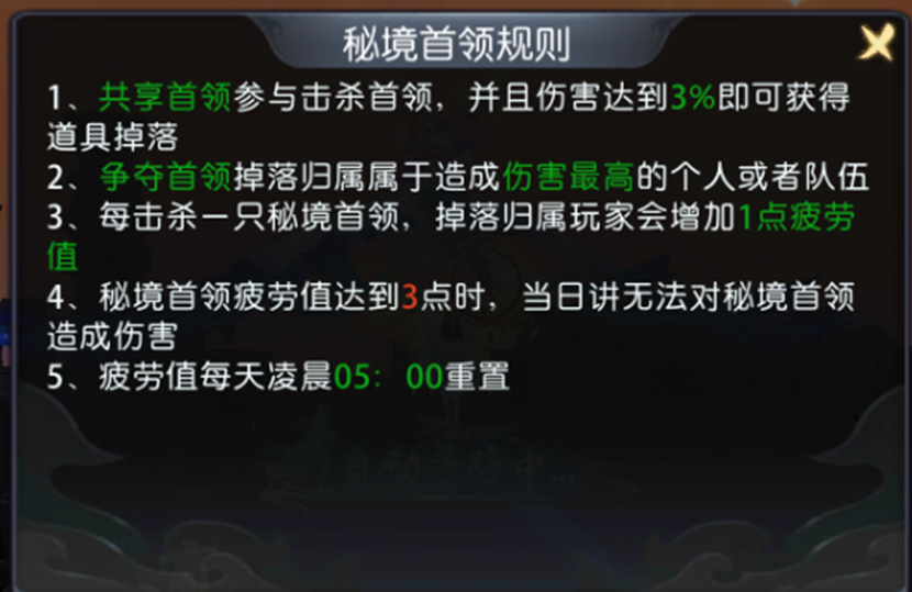秘境首领属于个人首领,有归属权,击杀后只有归属玩家可以获得奖励,并且一天只有3次击杀上限,击杀一次增增加一次疲劳值,疲劳值达到3则无法对boss造成伤害,但是仍然可以对玩家造成伤害