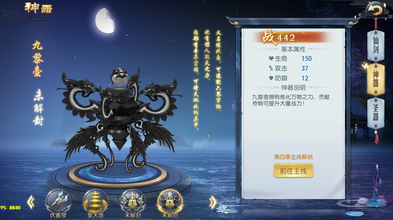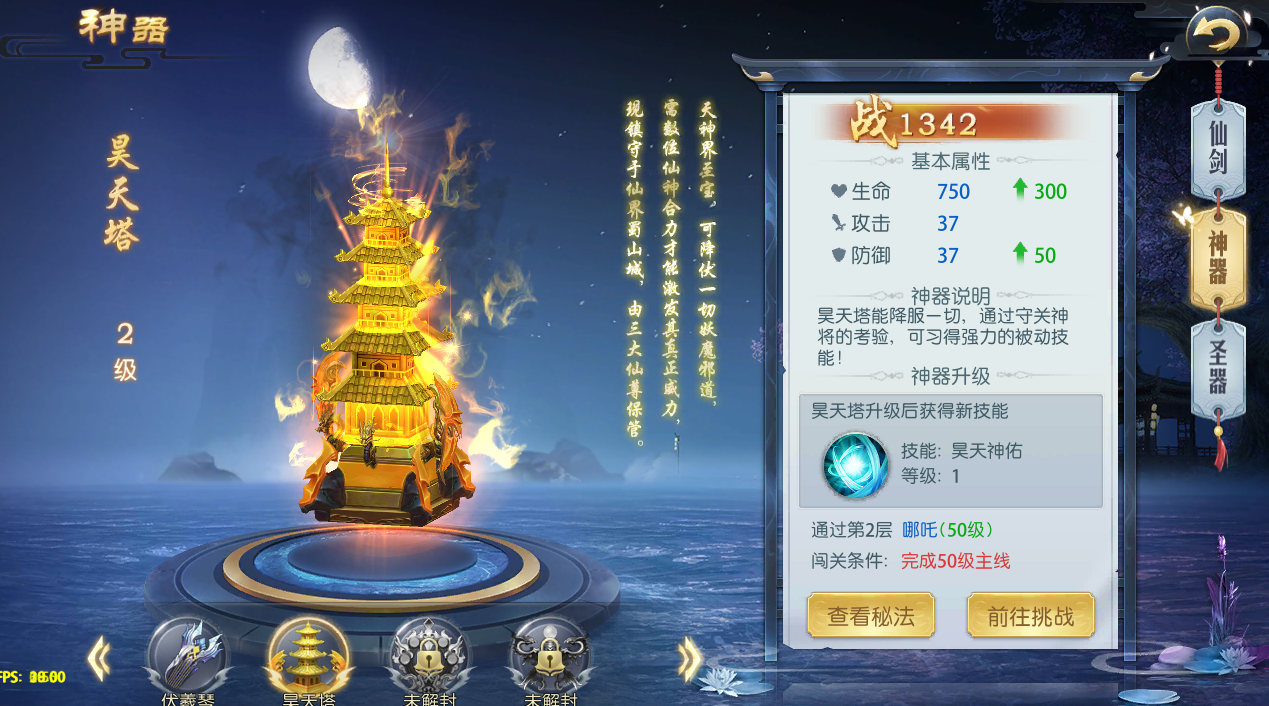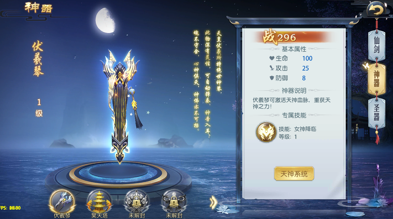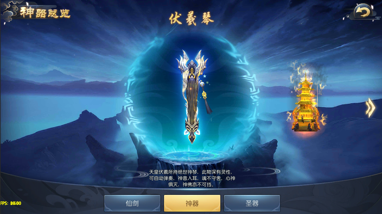 神器一共有5种,分别是伏羲琴、昊天塔、昆仑镜、九黎壶、女娲石,每一种都有对应的特殊技能,每种神器都需要完成相应的主线任务去激活,激活以后可以通过闯关挑战对技能进行升级
