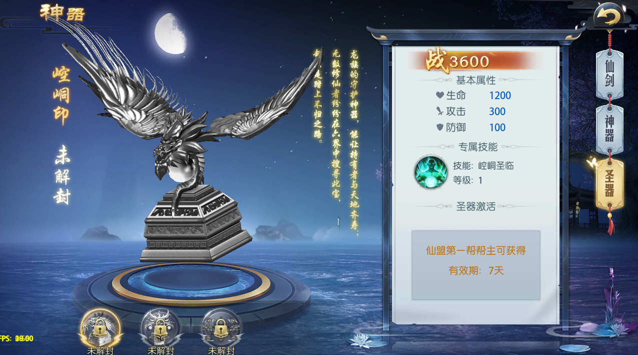 2、 每种圣器的激活条件都不一样,崆峒印的激活方式是成为第一仙盟的帮主,并且有效期为7天,河洛天书则需要购买黄金特权卡获得激活道具,而神龙鼎则是进行首充获得
